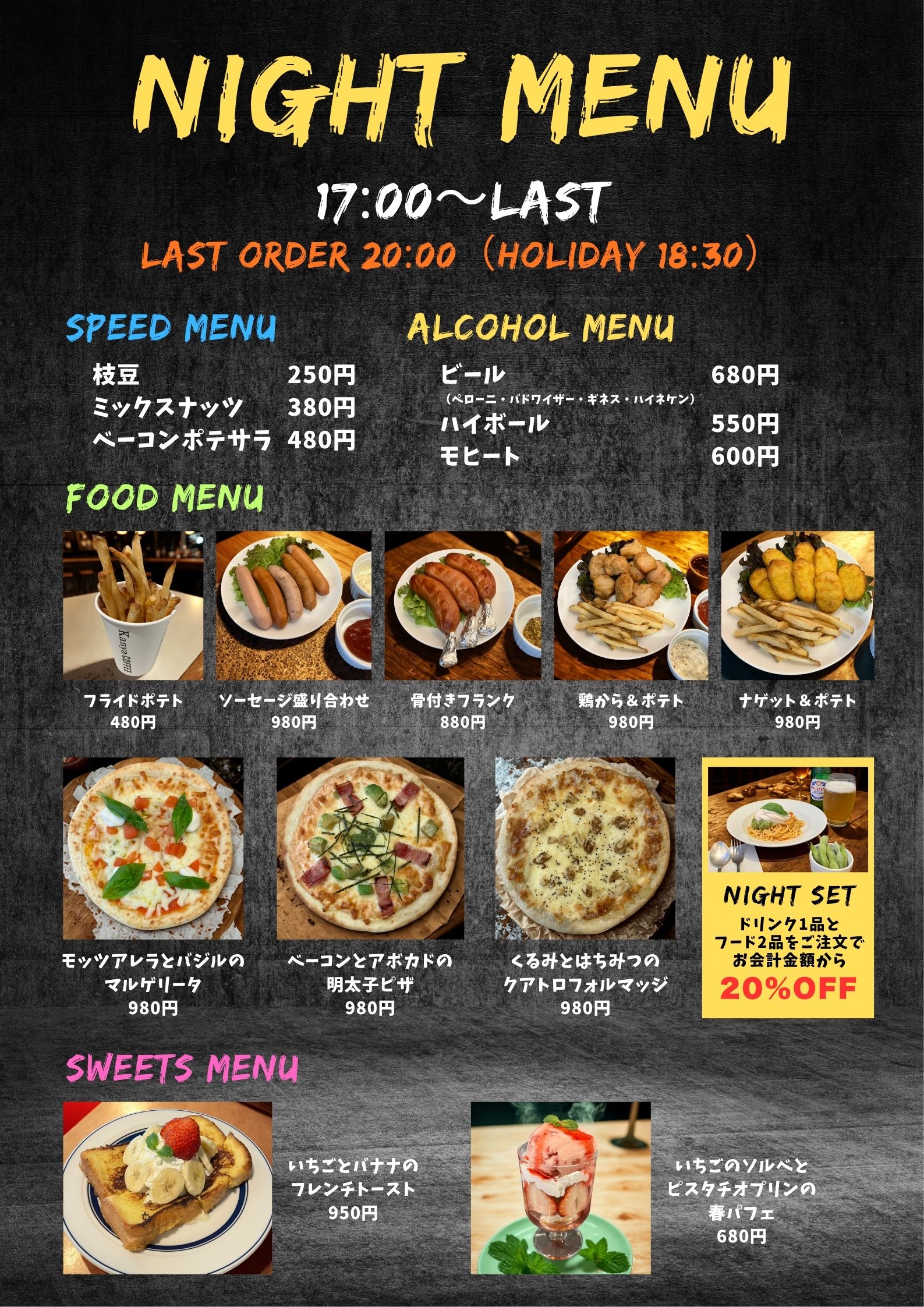 お得なナイトセットもございますので是非お仕事帰りに、お友達と夜にゆっくりお話ししたいときなどにお使いください。